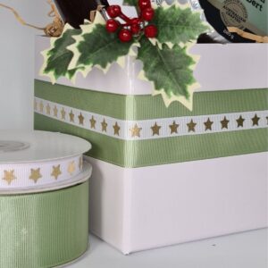109-010WGOGrosgrain with Metallic Stars – 10mm x 25mtrs / White with Gold