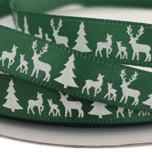 200-189GRNDouble Face Satin Ribbon with Christmas Tree & Reindeer Print – 10mm x 25mtrs / Green with White Print