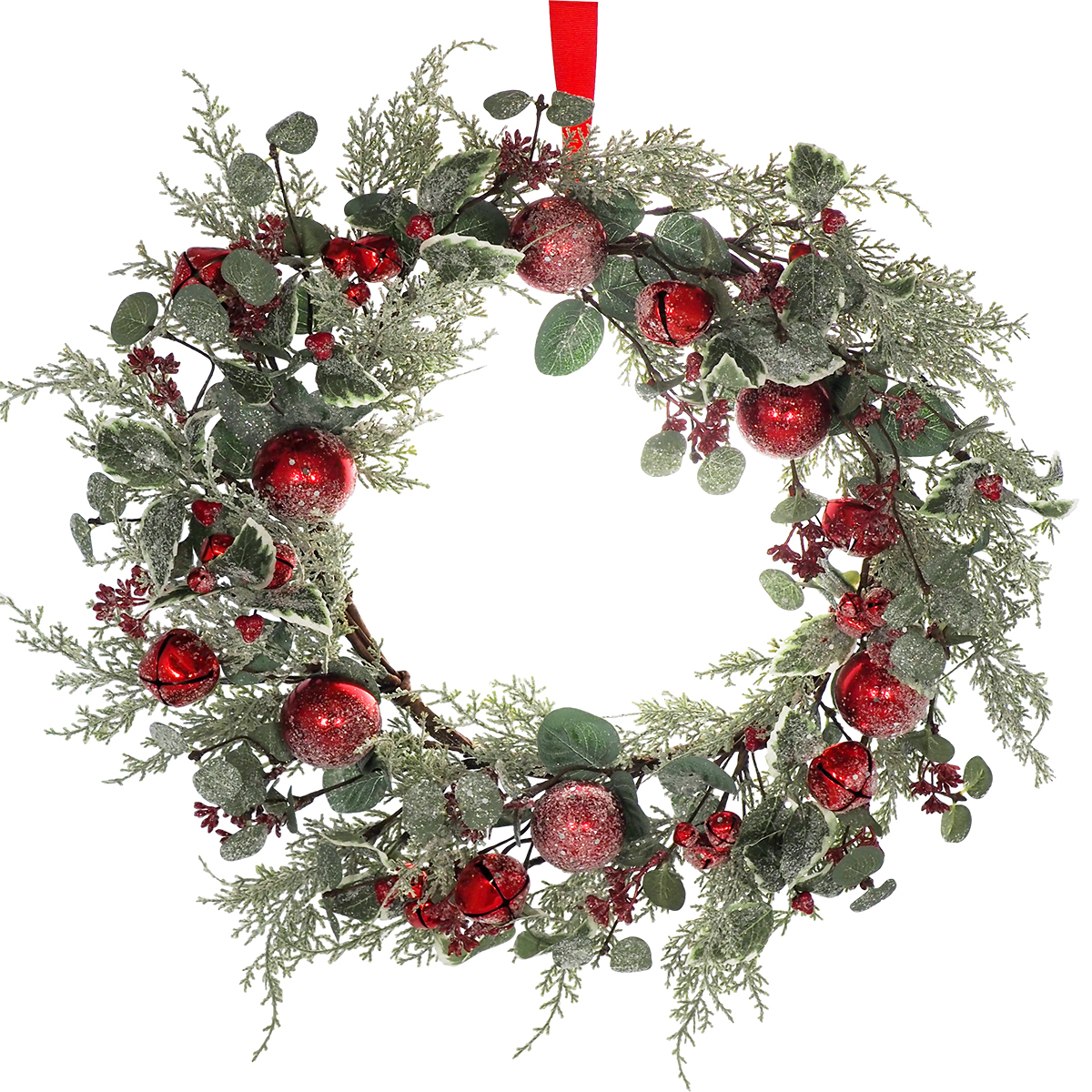 Welcome guests to your home with the timeless beauty of the Festive Christmas Wreath. Measuring 55cm in diameter, this classic red and green wreath captures the essence of holiday tradition. Adorned with frosted red berries, glossy baubles, and jingling bells, it’s set against a lush base of eucalyptus and fern sprays, creating a full and natural look.