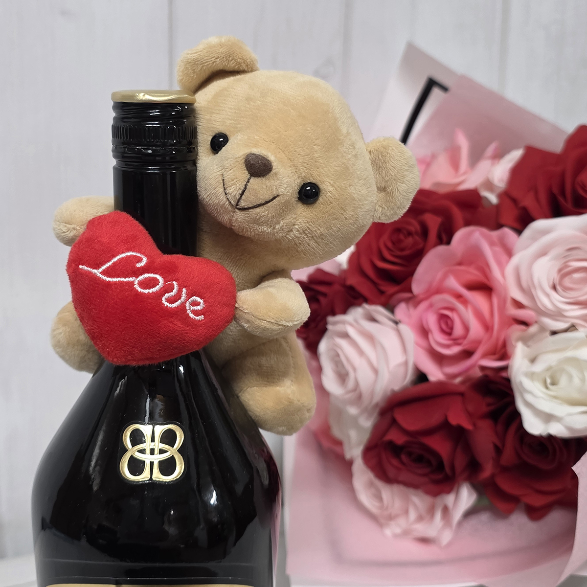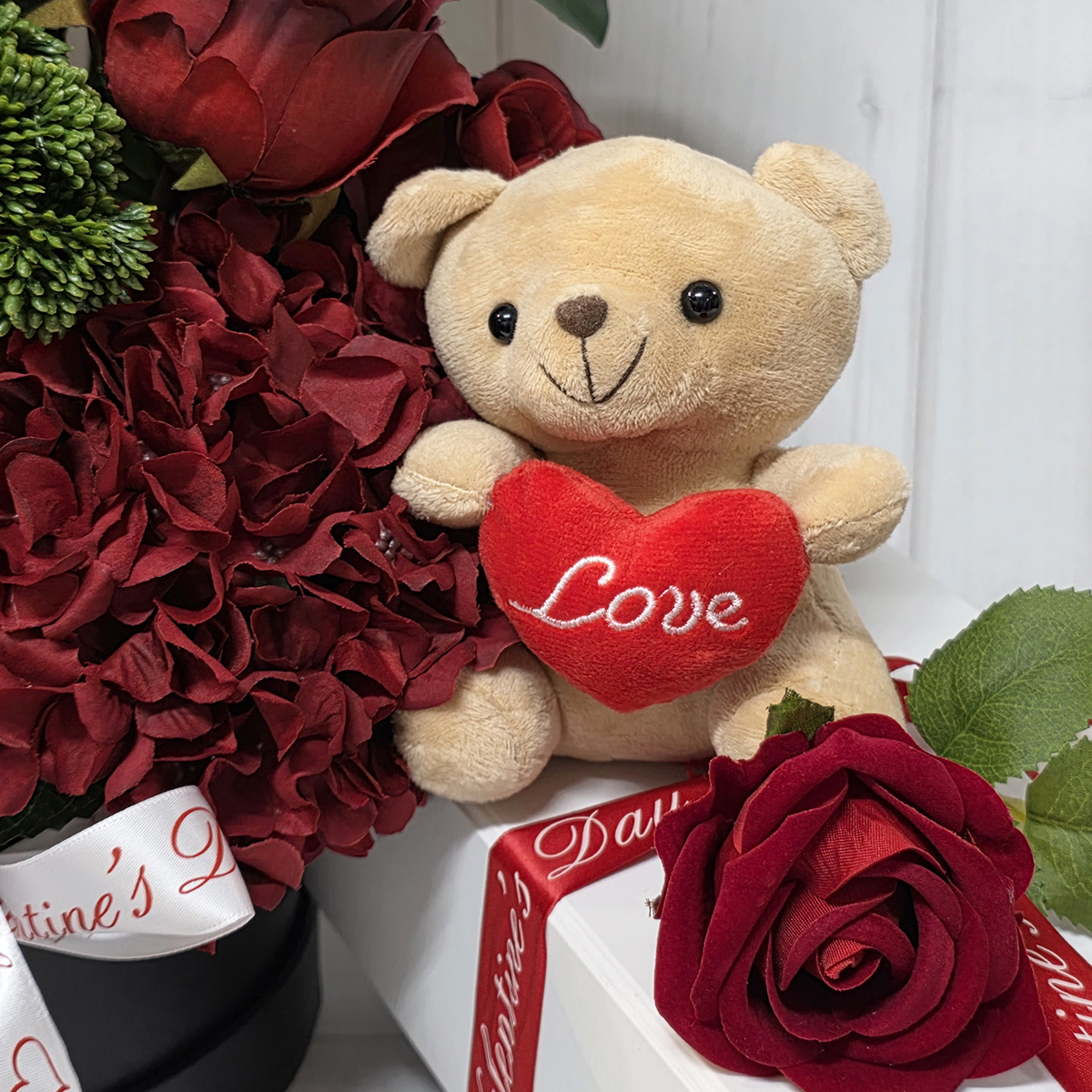 Remi Valentine’s bear is made from soft Lt Brown plush material and holds a red heart pillow with “Love” embroidered on the front. At 13cmH he is the perfect addition to a single Red rose or to any Valentine’s Day arrangement. The Lt Brown colouring suits most themes and packaging. The Red heart pillow is attached at the hands but has a gap away from the chest, allowing for rose stems or bottles of wine to slide between the pillow and body.