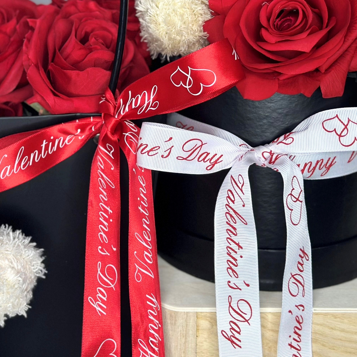 With a 25mm width, this ribbon is ideal when you want a statement bow that stands out on gift boxes, hamper packaging, wine bottles, and bouquet wraps. The classic red base with white print pairs perfectly with red roses, white blooms, greenery, kraft paper, and crisp white wrap for a timeless Valentine’s look. Each roll measures 25 metres, so you’ll have plenty of ribbon for repeat use across multiple bouquets, gifts, and seasonal displays.