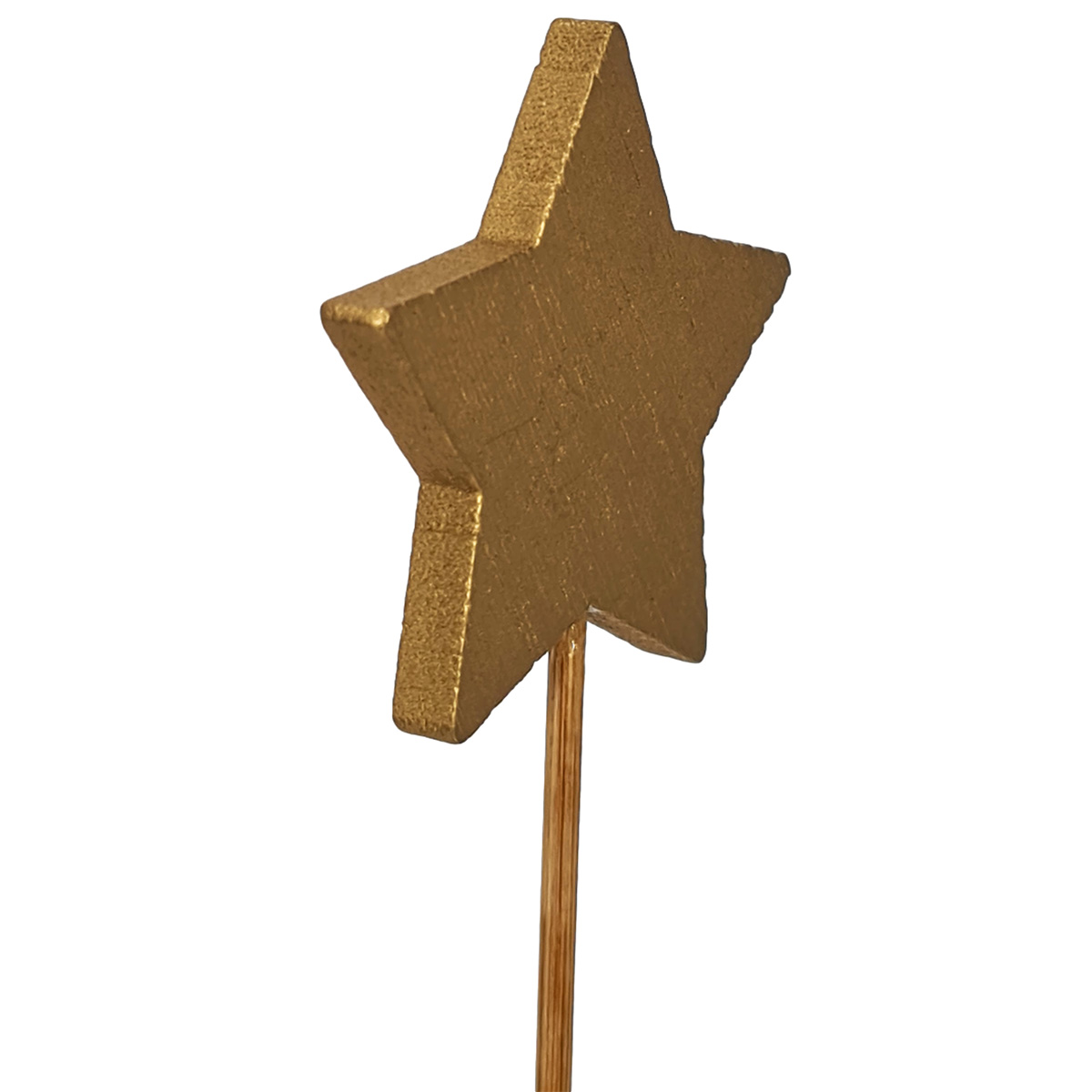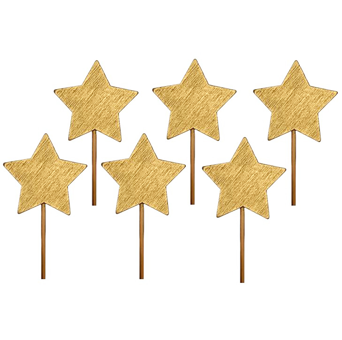 These star shape wooden picks feature a star measuring 7cm x 7mm thick on a long stick. Supplied in packs of 6 pieces, Available in 3 colours – Gold, Silver or White.