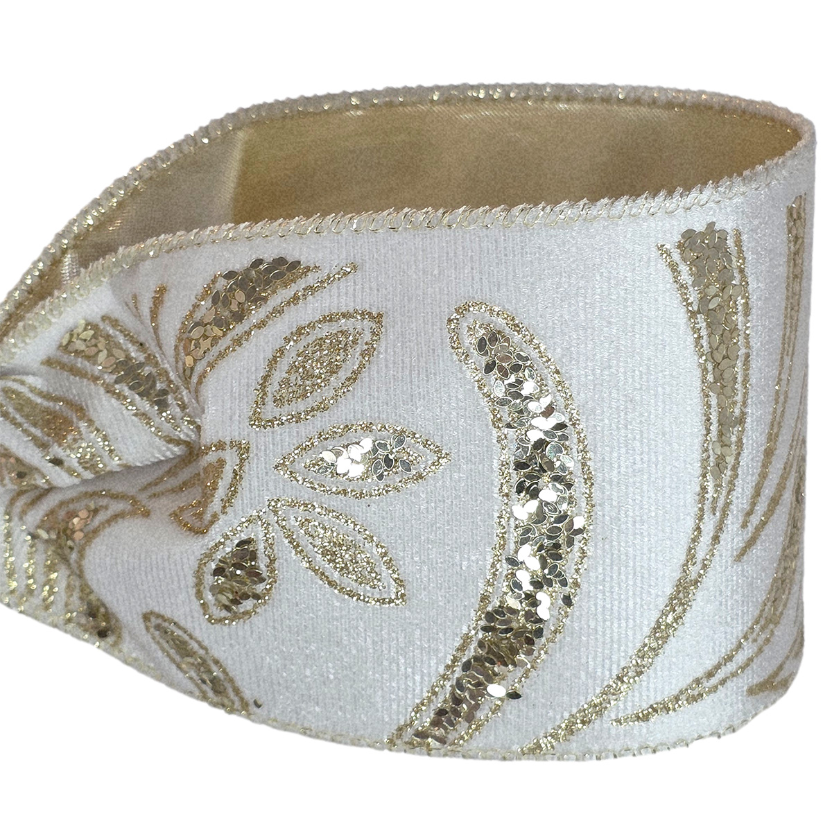Looking for premium wholesale Christmas ribbon? Our new Carnivale velvet Christmas ribbon features gold sequin trim in a stylish pattern on the front then backed with luxe gold metallic material. This premium ribbon is edged with sturdy gold wire to hold shape in any form. Use to wind through a Christmas tree for added texture and design, or create beautiful bows to decorate wreaths, garlands or tie on your tree. This ribbon is available in White/Gold or deep Red/Gold offering choice for your decor requirements.